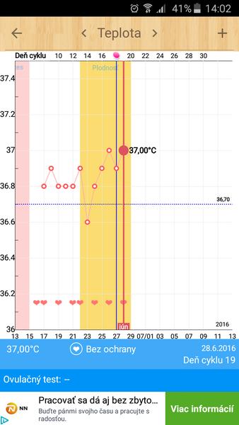 Dievčatá ak mi môžte poradiť, testy som mala pozitívne 12.-13DC, no ovuláciu mi to vyznačilo na 11DC, ale podľa mna bola včera, nakoľko mi až dnes vyskočila teplota na 37, nejako sa v tom strácam.Beriem inofolic a agnucaston, mam pocit, že mi tento mesiac nejako teploty skáču, predtým som mala stále pekné grafy.