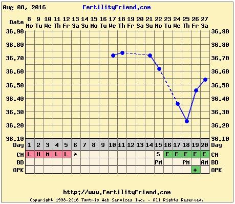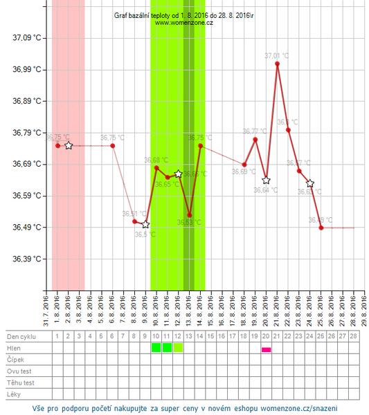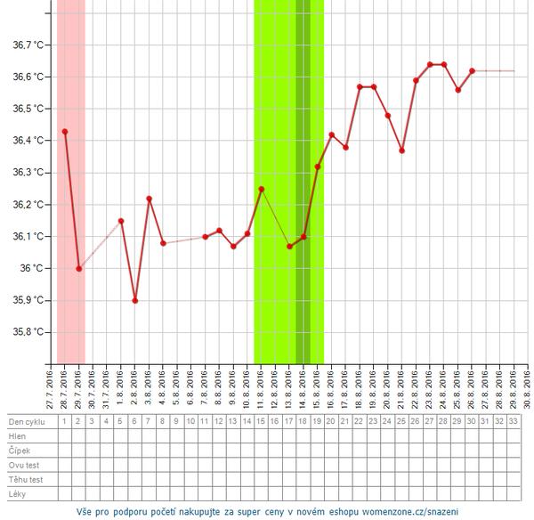 moj graf, netusim kedy bude ovulka, ci nahodou uz nebola, hlien este mam, vcera jasne pozitivny ovu test.. No tento mesiac kedze som mala dovolenku tak tie namerane hodnoty nebudu az take presne ako minuly mesiac. Co ma tesi, ze ovulka vyzera byt ovela skor ako inokedy (predtym na 25DC).. No prave tento mesiac, ked som nemala cas uzivat vsetky tie vitaminy, ani tabletky na stitku rano, chodili sme sa casto kupat do jazera kde bola ladova voda..myslim ze to nakoplo vajecniky k cinnosti, len dufam ze to nebude anovulacny cyklus, ked aj sexik bol tentokrat dufam nacas...