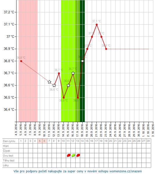 - implantační pokles - v době, kdy se vajíčko uhnízďuje, může dojít k jednodennímu prudkému poklesu teploty (a opětovnému vzestupu!). Tento pokles se může vyskytnout nejčastěji mezi 7.-10.DPO, ale výjimečně se může objevit už od 5.DPO, popřípadě až 11.DPO. Opakuji, že přítomnost tohoto poklesu nutně neznamená těhotenství a naopak jeho absence ho nevylučuje, přesto bývá s těhotenstvím často spojován. Nepleťte si ho ale s poklesem před MS - pokud například Vaše luteální fáze trvá obvykle 11 dní a 11.DPO dojde k prudkému poklesu, daleko pravděpodobněji se jedná spíše o znak přicházející MS nežli o těhotenství ☹