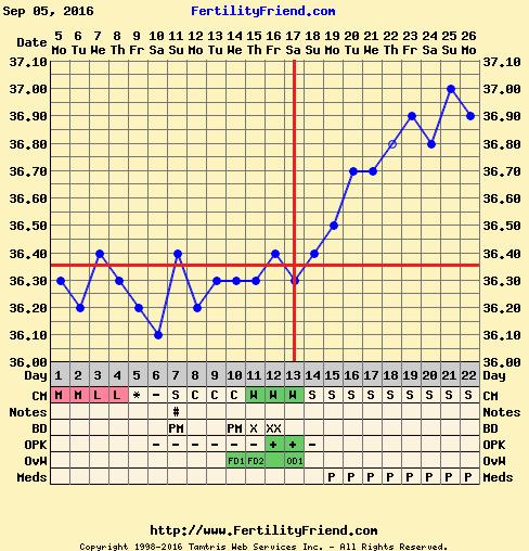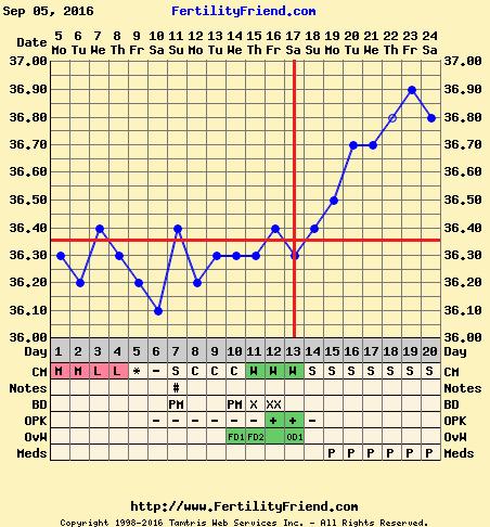 Ideální těhotenská křivka by tedy vypadala takto - ovulace se projeví výrazným vzestupem, krátce před ní je milování. Zhruba týden po ovulaci dojde k prudkému jednodennímu poklesu, po kterém dojde k druhotnému zvýšení teplot, v tomto období také může dojít ke špinění. Po uplynutí obvyklé doby luteální fáze teploty neklesají a menstruace nepřichází.