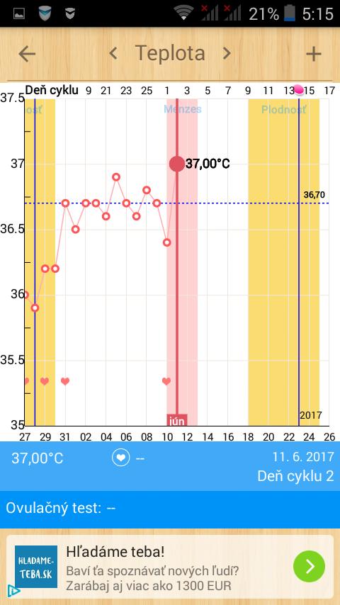 ahojte všetky, tak ja už mam aj normálnu teplotu zvýšenú na 37,3 takže predpokladám že ten výskok v grafe bude mať asi nejakú inú príčinu, i ked sa vôbec necítim chorá, len strasne slabá, rastie mi zub, tak asi to bude z toho. nič to. v priatok idem rezať dasno, lebo to hrozne ubolené mám. tak sa drzkajte všetke❤