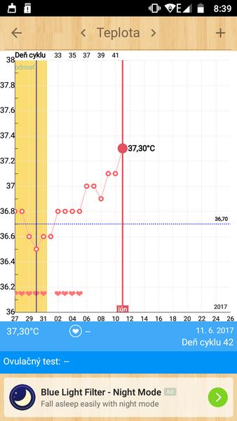 ahojte všetky, tak ja už mam aj normálnu teplotu zvýšenú na 37,3 takže predpokladám že ten výskok v grafe bude mať asi nejakú inú príčinu, i ked sa vôbec necítim chorá, len strasne slabá, rastie mi zub, tak asi to bude z toho. nič to. v priatok idem rezať dasno, lebo to hrozne ubolené mám. tak sa drzkajte všetke❤