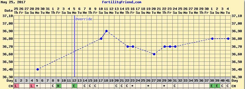 No baby, tak ja prestávam rozumieť môjmu cyklu... Minule som tu tento môj graf dávala (tesne po mrche), lebo som mala teploty aj "po" poovulačné... a ono sa to ďalej takto drží. Tam, kde mám naznačené prvé špinenie (na 23.DC - o tri dni skôr ako mal)) som mala normálne mrchu, len som to zaznačila takto, aby mi FF nerozdelil graf, keďže som chcela vidieť vývoj teplôt aj ďalej... a ono sa mi to stále drží na poovulačných...