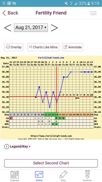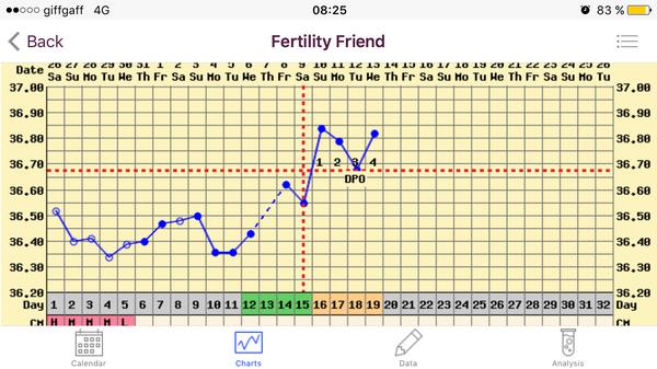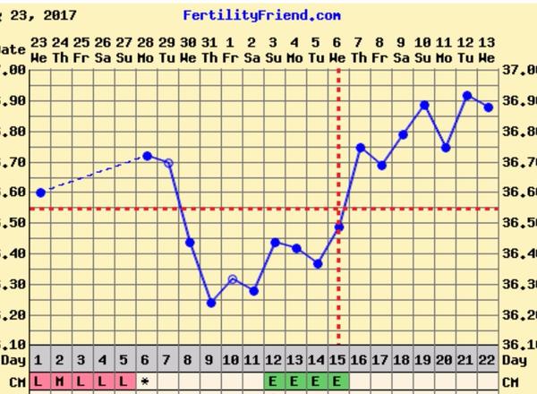 grafik mas pekny.Ta prerusovana ciara je pre to ,lebo FF nevie vyhodnotit naozaj ovulku.Ta mohla byt 15-teho,ale aj 12-teho.Keby ze je 13-teho teplota povedzme 36,6 ,tak ovulka mohla byt aj 12.