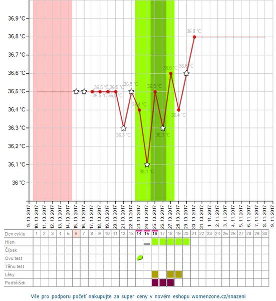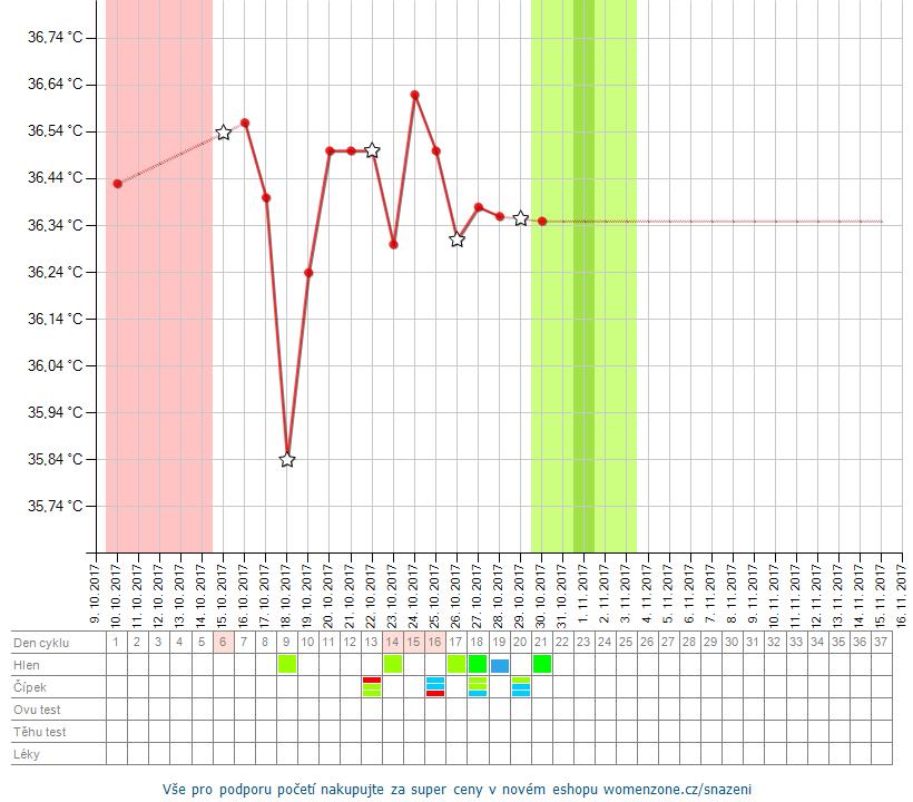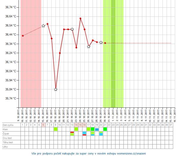 Dobre ranko dievcata, prosim Vas, vedeli by ste mi poradit s mojim grafom? Meriam si prvy mesiac takze sa v tom nevyznam, no uplne zblbol ten graf. Takze tento vikend 27-29.10 som mala virozu tak mi teplota hned v sobotu stupla upne vysoko, mala som aj cez den zvysenu teplotu, no a teraz mi graf zacal ukazovat, ze som uz po ovulacii co vsak nie je mozne lebo 26.10 som bola u lekara a folikul mal iba 12mm, takze k ovulacii tak ako to ukazuje graf nemohlo dojst. Neviem teraz ako to mam brat, ci vymazat tie vysoke teploty a merat dalej alebo co s tym :( Dakujem