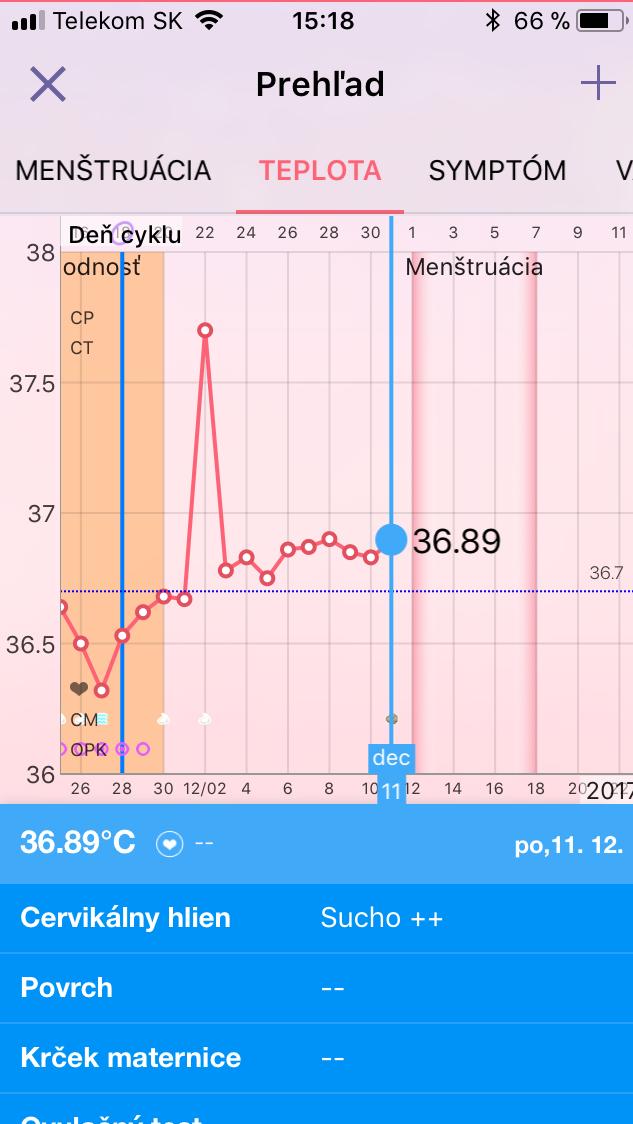 @ceklis a meriavas v rovnakom case rano po prebudeni? Lebo tie prazdne kruzky v grafe na vyske teploty na dany den signalizuju, ze bolo nieco ine v merani. A zvycajne to byva cas. Pokracuj dalej, ak mas aj testy neg. Pravdepodobne este ovulacia nebola.