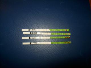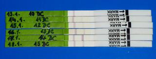 neviem ci to bude dobre vidiet, ale takto nejako by to malo vyzerat - par dni pred ovu by mala testovacia ciarka silniet, ale kym nie je taka silna ako ta kontrolna, ktora je stale rovnako silna, tak ovu nenastala (a test sa povazuje za negativny). Ovu je ked je testovacia ciarka rovnaka, alebo silnejsia ako kontrolna (na tom druhom teste odspodu) 🙂