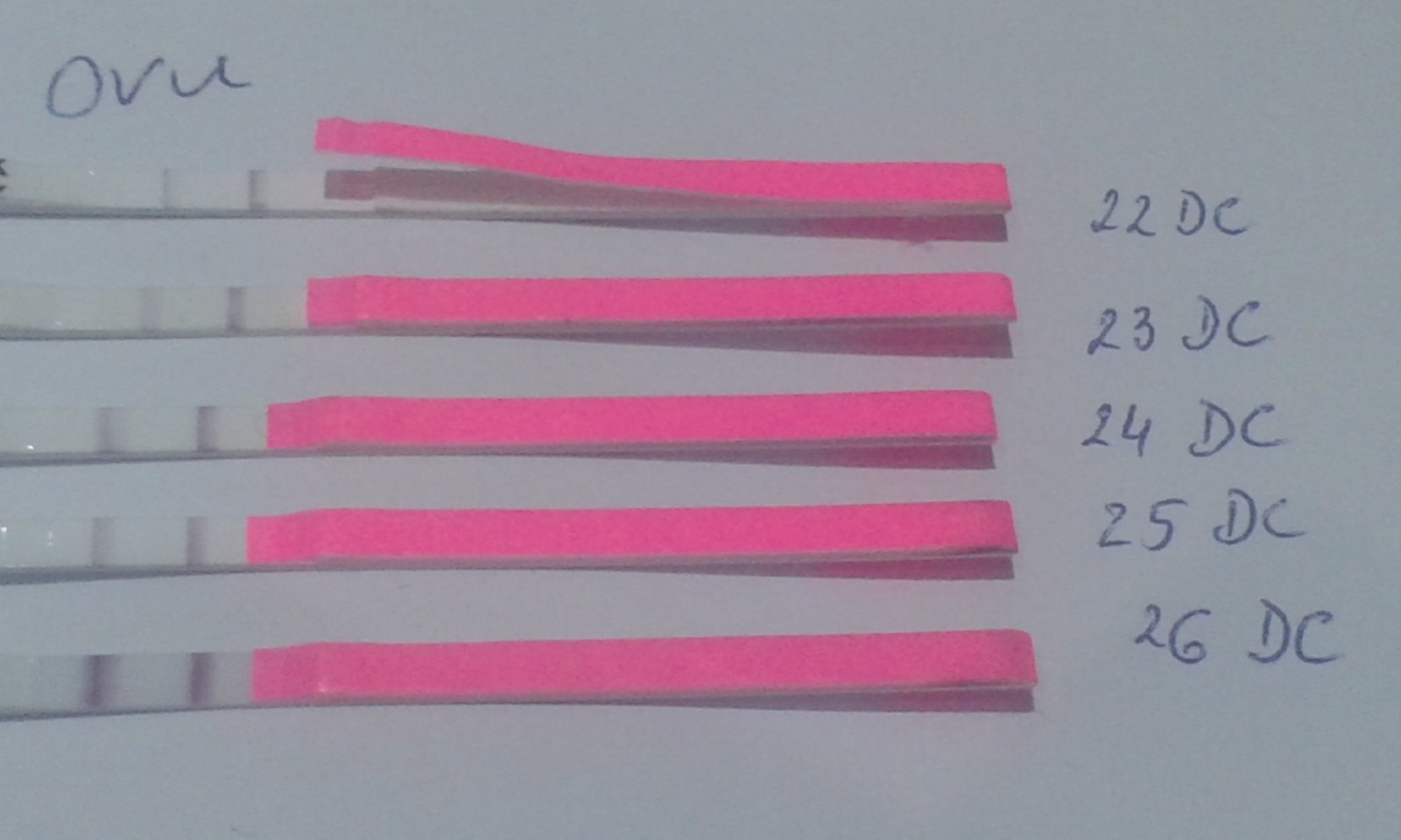5-ty mesiac snaženia. Ružové a modré sú ovu testy, ktoré som si robila len tak, lebo ich mám veľa. 😀 Skúšala som, či silnejú. Sú však inej značky, čo je aj vidieť na intenzite sfarbenia. Tehu test som si robila 22 DC, ale "duch" bol taký slabý, že som ho videla len v určitom uhle. 24 DC už bola čiarka aj ružová a 26 DC zosilnela. Teším sa. 🙂