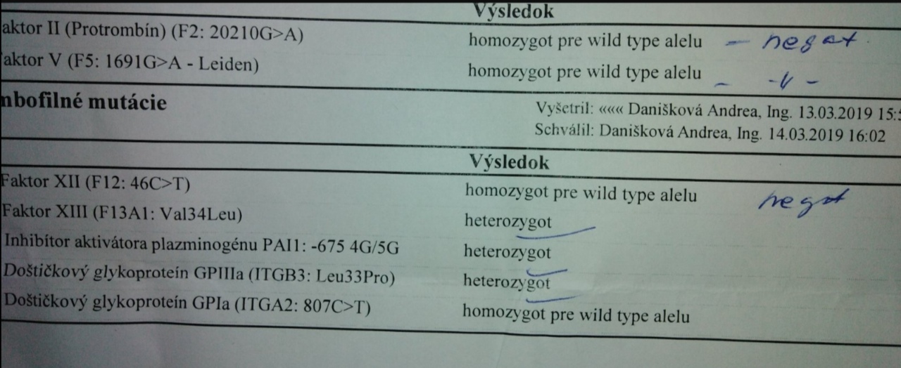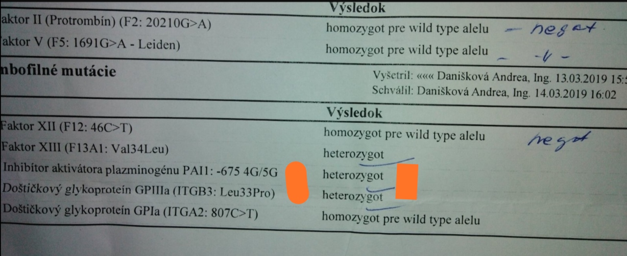 Ahoj natrafila som na túto tému ...mám presne tieto dve mutácie čo máš aj ty ale moja hematologicka povedala že hneď ako budem tehotná sa mám hlásiť lebo tá GP IIIa je taká mutácia čo musí byť podchytené hneď od začiatku tehotenstva vraj budem brať anopyrin že ten je na tieto dostickove mutácie najlepšie a od 3 trimestra po 6 nedelie pichať injekcie ...a okrem toho povedala že pri nej nemôžem brať ani antikoncepciu a keby sa mi zhoršil zdravotný stav ako napríklad že mám ďalšie pridružené ochorenie tak musím byť pravidelne sledovaná na hematologii takže až také nič to úplne nie je 🤔🤷