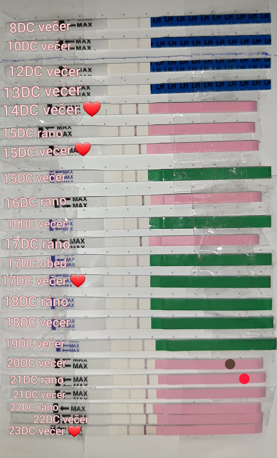 snažilkujeme už nejaký čas a tento cyklus som sa rozhodla testnúť ovulku a zatiaľ som z toho mimo. Je normálne že mi ovu testy vychádzajú takto? (mávam 30 - 31 dňové cykly) 20DC som mala slabé hnedé špinenie skôr len pri utretí a 21DC trošku krvi taktiež len pri utieraní. Od vtedy miestami pociťujem pichanie v podbrušku a skôr také pnutie prsníkov.