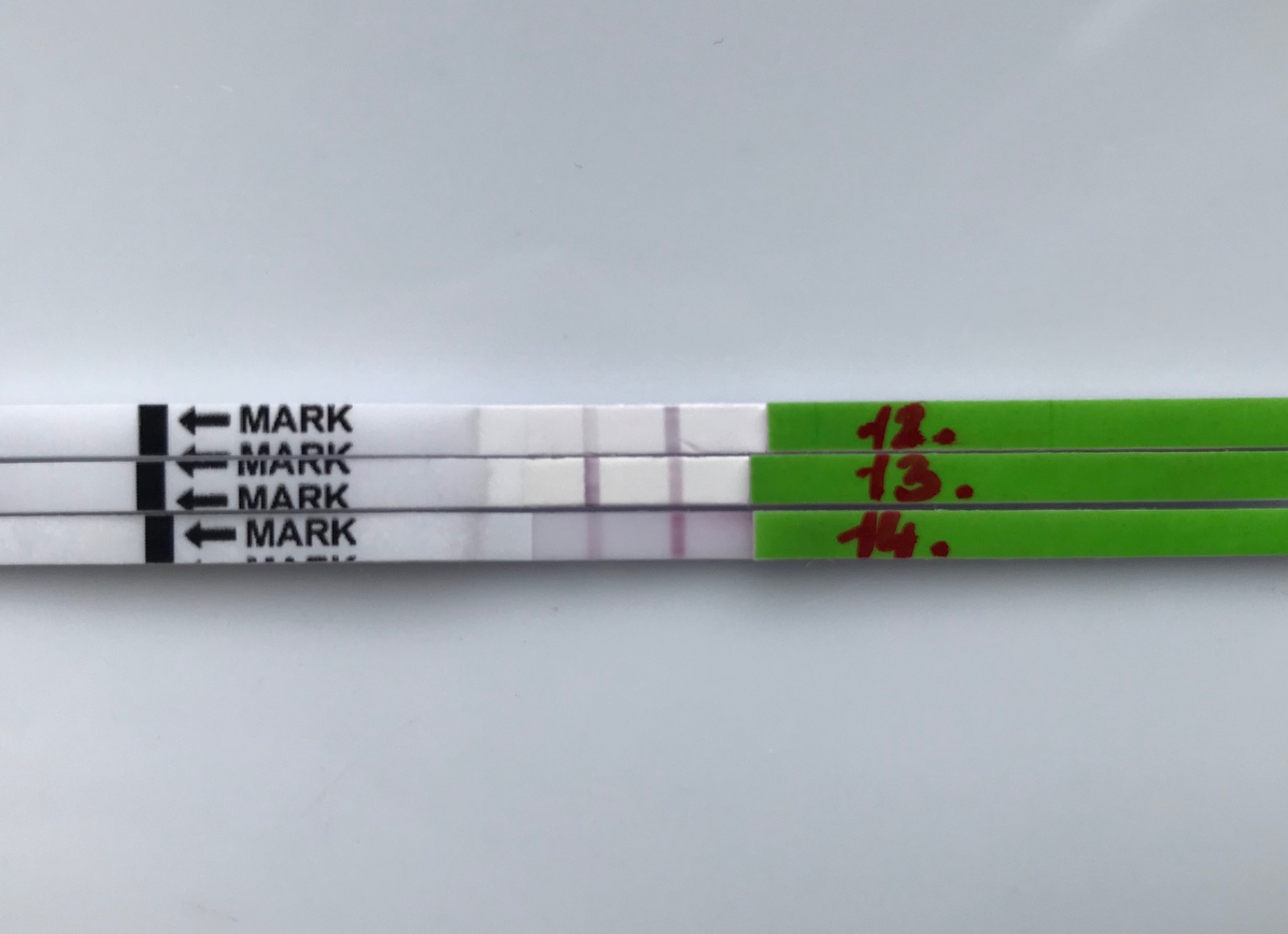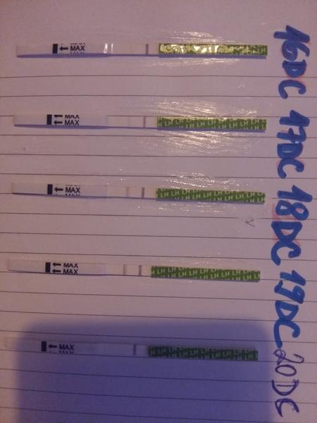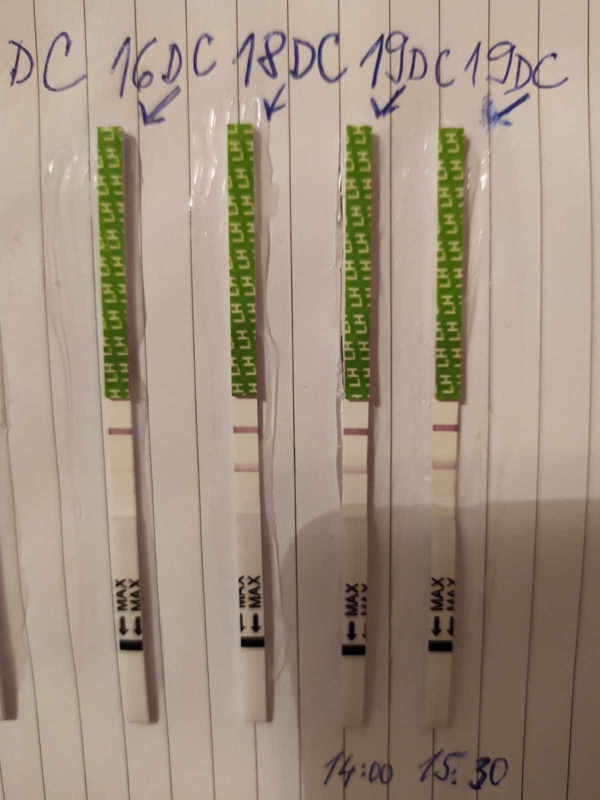 @kikirda ahoj, podľa mna už negativ, aj keď blízko mal 18.DC.. neviem v akom čase si ho robila, ale je možné, že mal vyššiu hladinu o pár hodín neskôr.. hladina niekedy prudko klesne.. skús testovať ďalej a uvidis či bude blednúť.. na porovnanie moje dnes 14.DC.. včera bol pozitív.. Každopádne Ti držím palce.. mne sa už minuli testy a teda kašlem už nato.. nejdem nič už rátať, stačilo 3 mesiace nechám tomu už voľný priebeh.. ja som bola len zvedavá či tie testy fungujú 😉