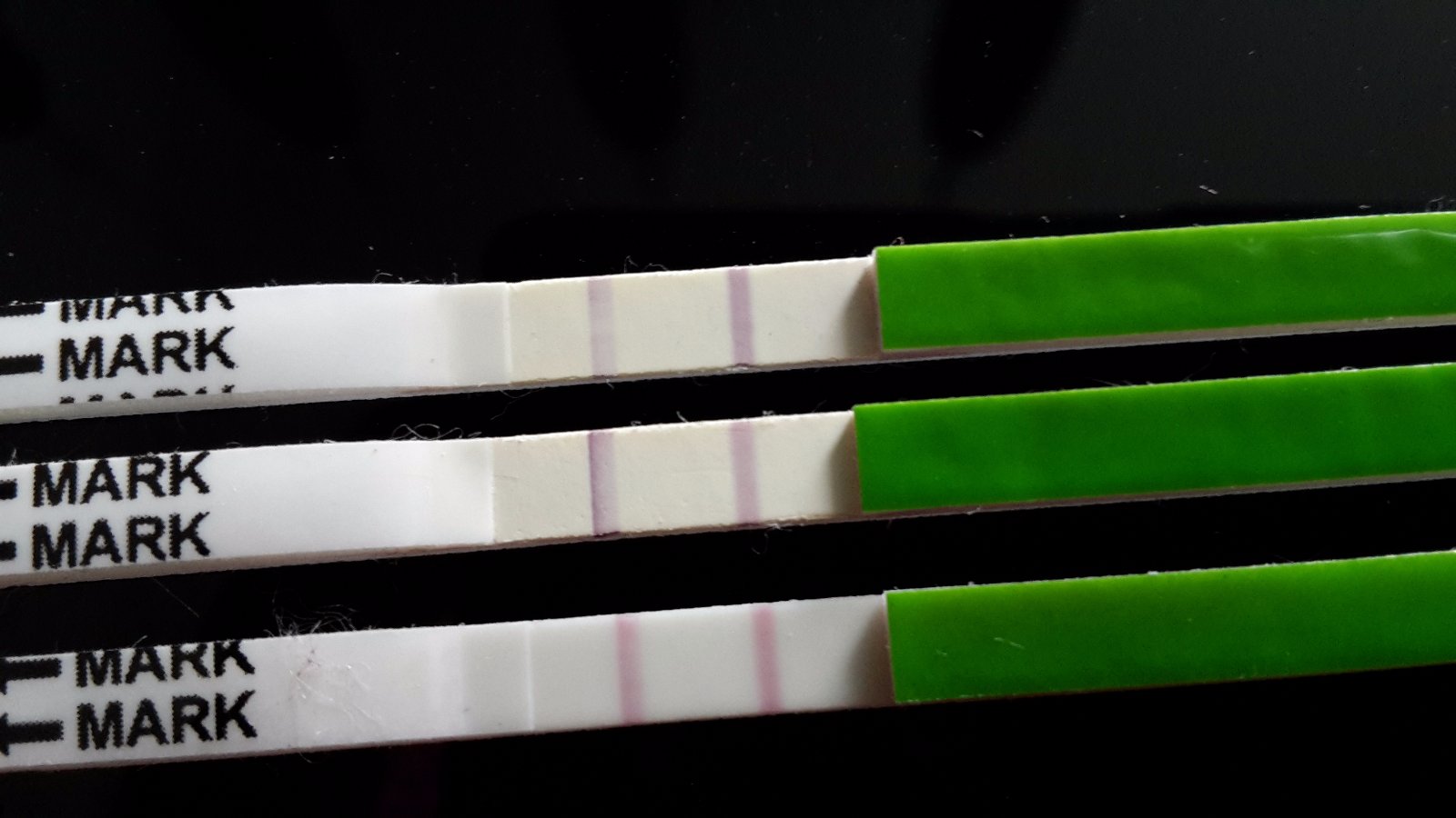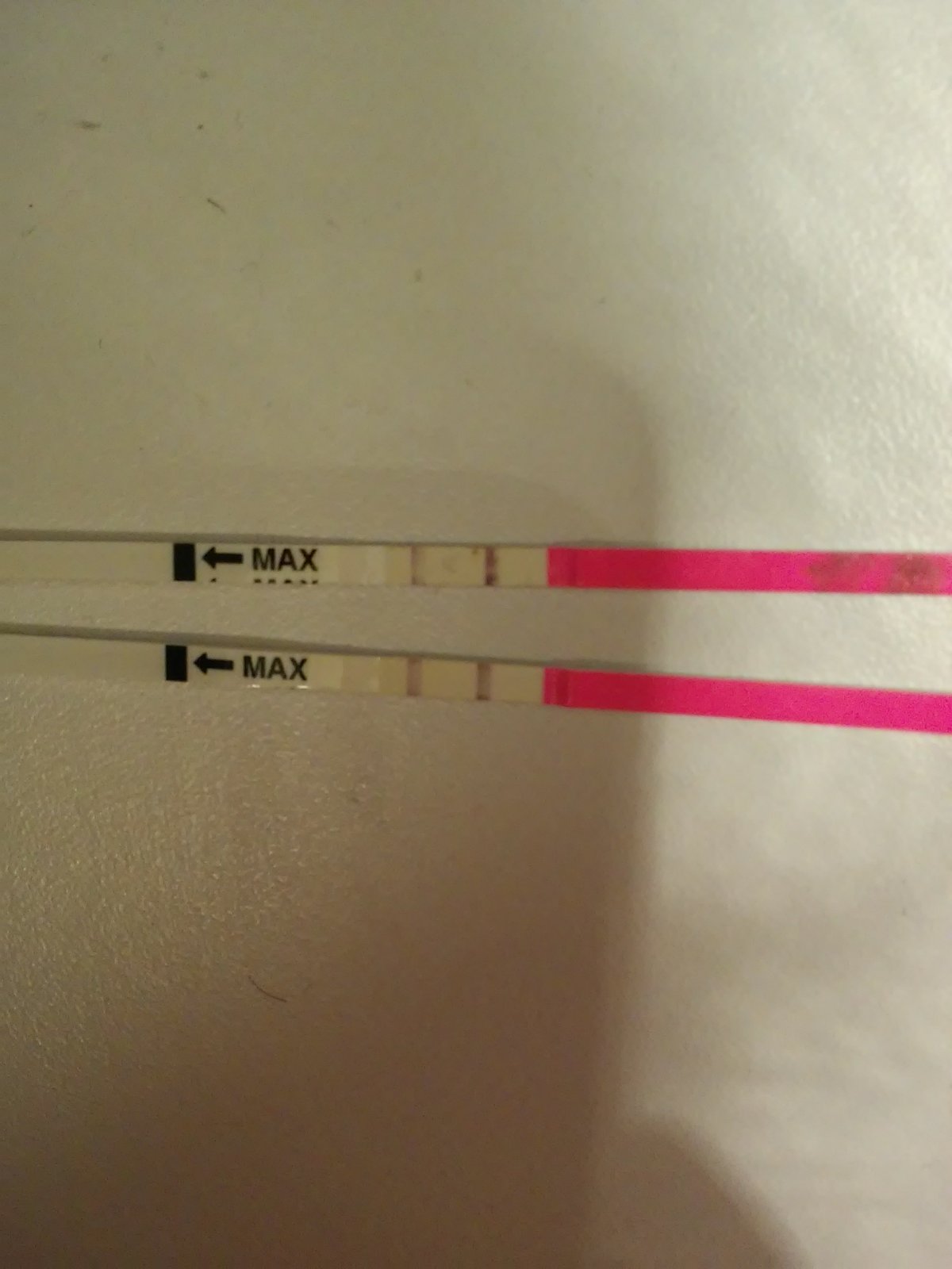 Pridavam dnesnu fotku.vrchny zo vcera a spodny dnes.je viditelne tmavia ta druha ciarka 🙂 dnes 17den cyklu.