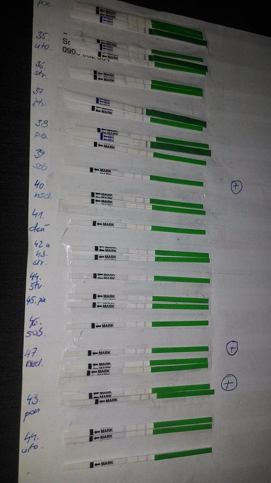 Tak ja som už z toho riadne mimo... Pred viac ako týždňom dva dni po sebe s pozitívnymi ovulačnými testami, návšteva doktorky však nepotvrdila, že by sa nejaká ovulácia v ten deň mala konať (16mm folikul), potom negatívne testy. Teraz zas nedeľa, pondelok pozitívne, včera negatívne a dnes zas pozitívny. POMÓC! Samozrejme graf nenasvedčuje ani ovulácii a ani tehotenstvu. Začínam si myslieť, že mám nejakú vadnú sadu testov, ale skúsila som to na synovi a tam sa objavila iba kontrolná čiarka. Dnes som 49DC a od 33DC mám dosť viditeľné aj testovacie čiarky. Tehotná nie som, ale nemôžem to ani 100%ne vylúčiť, ale graf hovorí jasnou rečou - anovulák zatiaľ. http://www.fertilityfriend.com/home/5f9e12