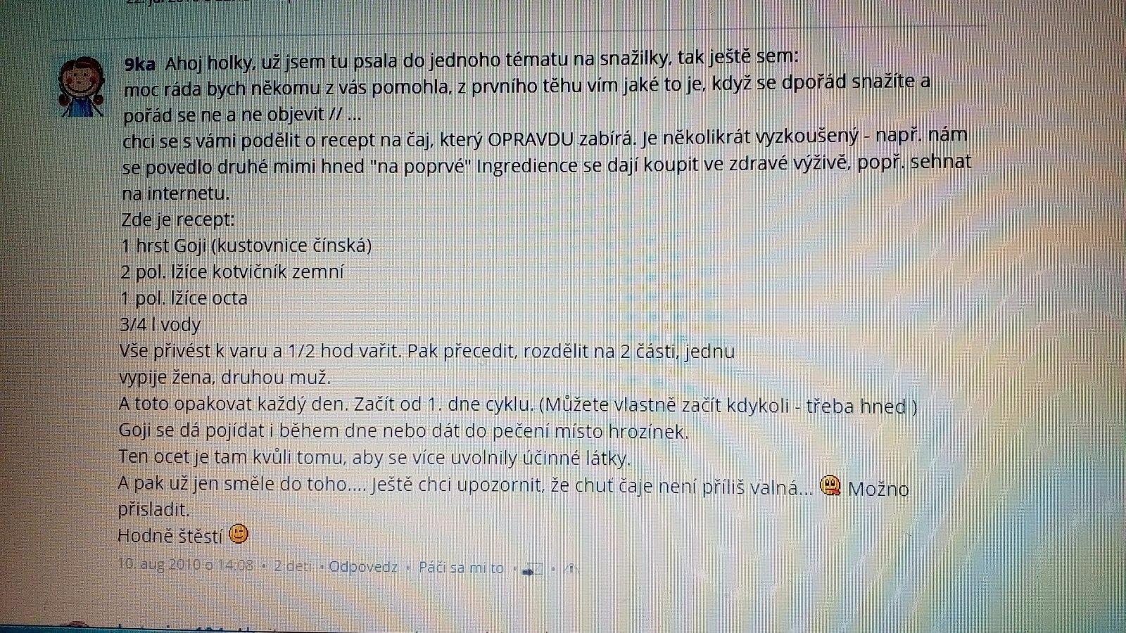@kakatulik ja poctivo veru,sa mi celkom dari,ale asi uz teda douzivam a dam pauzu,aloe som kupila litrovu flasu,pila som za odmerku dvakrat denne,len ma to po ovulke odradilo,lebo tam bolo pisane,ze nieje vhodne pre tehotne zeny a ja som po kazdej ovulke aspom teda v hlave "tehotna" 😀