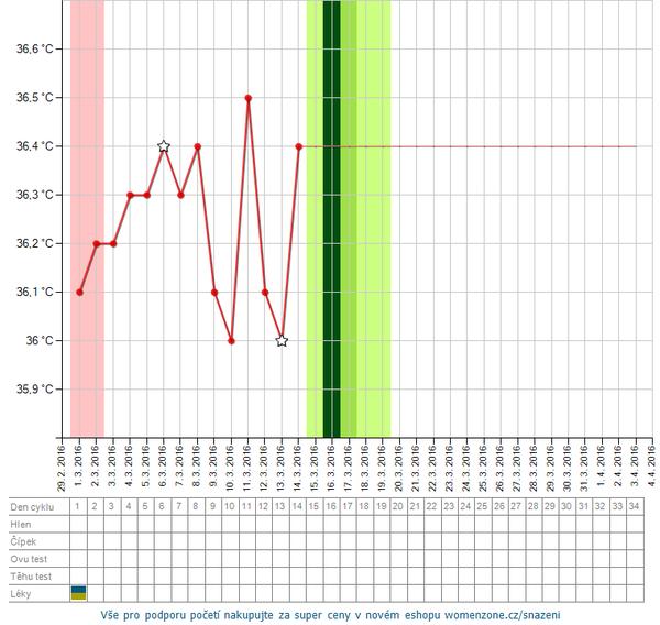 Inak sme teraz takmer na rovnako.Ja 15DC.Twplota u mna dnes sice vyraznejsie stupla,ale napriek tomu si myslim,ze ovulka tento mesiac asi nebola.... 😒