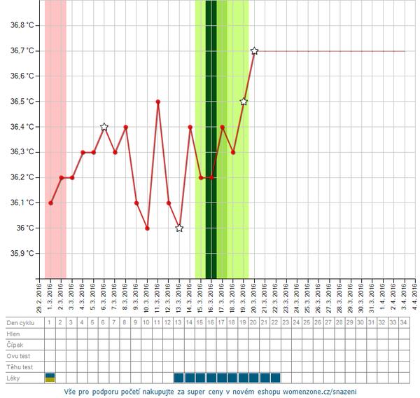 Dievčatá, tak po víkende vôbec neviem na čom som. ☹ Boli sme s manželom na výlete aj sme tam dve noci spali aj si večer popijali v piatok v noci som sa spotila zobudila som sa o 4:15, že zmeriam a 36,9 to nemavam ani po ovu. Tak som vyvetrala išla na WC ľahla si zmerala znovu, že 36,0 medzitým som zaspala zobudila som sa o 8:15 zmerala som a teplota bola 36,6, tak teraz neviem čo mám zaznačiť. Tak som vypocitala priemer teplôt na 36,5 a to som zaznačila do grafu. V nedeľu ráno som merala a to už mi aj po hodine odkedy som sa zobudila a ležala ukazoval teplomer 36,7 aj to je na mňa dosť vysoká teplota. Ovu testy som dva dni nerobila tie čo som spravila vyšli zvláštne. ☹