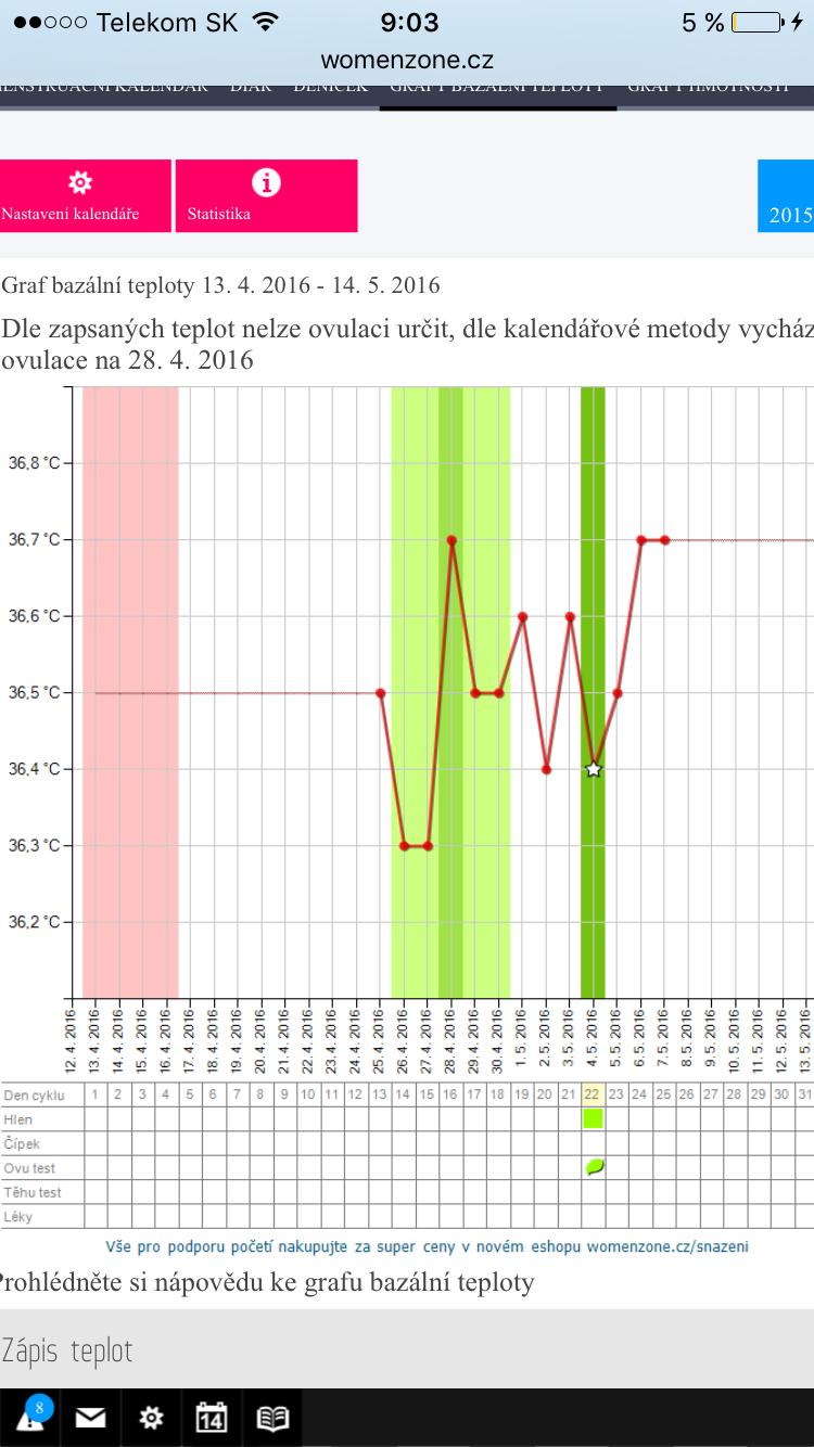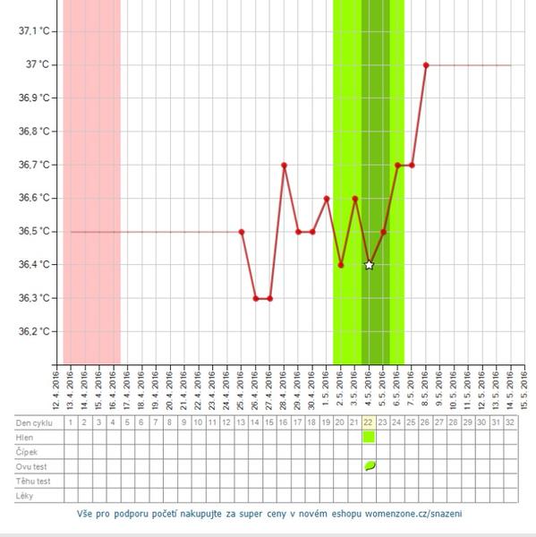 @kchan ahoj no ovulku som nemala vtedy ked je to vyznacene zelenym...to mo tak vypocital system ale pozitivny test som mala az 4.5 na 22 DC. Takze do uvahy beriem tie posledne udaje na grafe