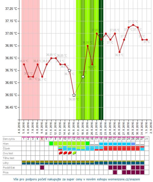 @lauritkatesty ahoj.tak zasa idem za tebou.Vobec nerozumiem tomuto.teda este sa mi to nestalo sby mi takto klesla teplota ze 36.9 pritom som len 23dc.Vzdy sa mi teplota drzi minimalne na 37.1 a az den pred mrchu klesne na 37 a v den mrchy 36.9.myslis ze pride mrcha ked mam 28-29 dc?dakujem za kazdu radu...teda nazor.som zmatena pretoze este vcera ma bolelo brucho na mrchu no teraz nic len velmi citlive prsia mi zostali.dakujeeem moooc tu je graf