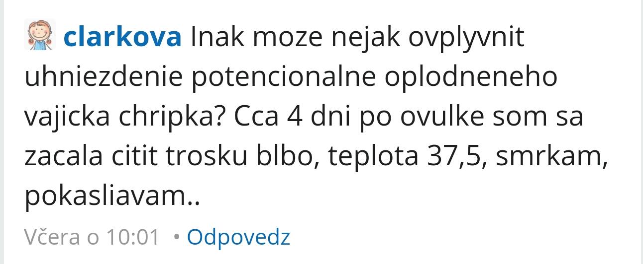 @clarkova ahoj. Vies co ja asi ja som mala pred par dnami teplotu 38. A stradne ma kolena boleli. Myslela som si ze normalne umriem.... strasne som sa citila. Na druhy den uz som bola bez teploty nic mi nebolo iba nadcha mi ostava. Mala som aj ovulku na 11ty DC a snazili sme sa o male. Teraz v sobotu by som mala dostat mrsku. Tak uvidime. Ci to bolo kvoli tomu ze som tehu alebo to bol len nejaky vyrus... takze je to 50 na 50.... netrpezlivo cakam lebo test si robit nechcem... a tehotno sa necitim ☹ tak uvidime 😣😣