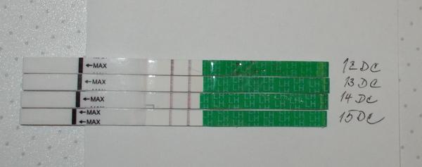 @gabcca mne sa zda praveze ten 12+13DC najtmavsi. 14DC uz slabne a je slabsi ako ten kontrolny. no podla instrukcii v navode este stale pozitivny. ten 15DC uz sa mi zda slabsi,a le negativny nie je, lebo tam sa mi zda slabsi aj ten kontrolny pasik. mala by sa hodnotit aj sila sfarbenia v porovnani s kontrolnym pasikom, lebo sa moze stat, ze sa to niekedy nenapije tak vlemi,a ko by bolo treba a preto vyjdu oba pasiky rovnako silne, ale slabsie, ako pasiky na ostatnych testoch. a teda pozitivny je ked su rovnake, pripadne ten testovaci je silnejsi,a ko ten kontrolny.