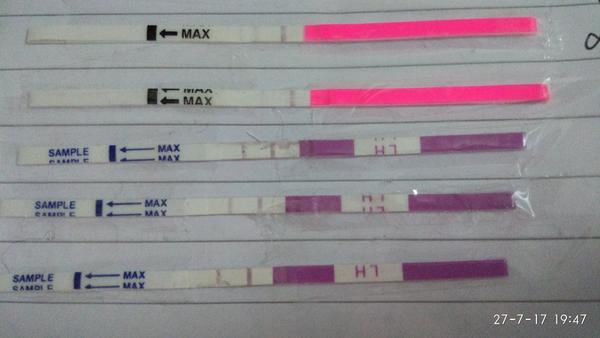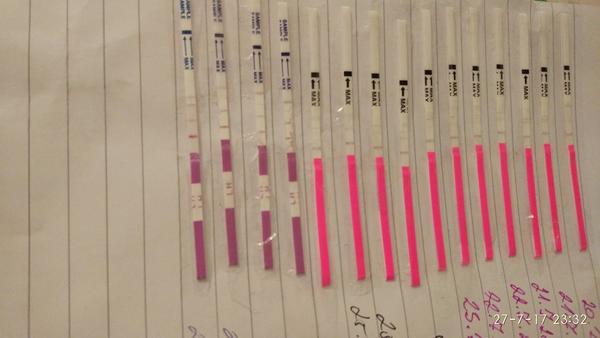 Ahoj, mne sa zda ten prvy fialovy test najsilnejsi, potom to trochu slabne i ked aj ten posledny je dost silny. Iba meranim teploty zistis ci ovu naozaj prebehla. Ja na tvojom mieste by som este dnes a zajtra testovala a uvidis ci bude silniet ci slabnut.