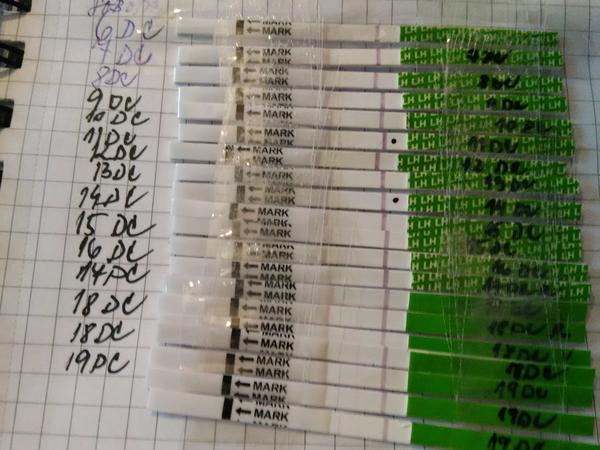 ja mám takúto zbierku... ruzove su s citlivosťou 20, dnes zelený s 25 tak neviem ci kvôli tomu moze byt zoslabnutie čiarky alebo zly čas testovania a nedobrý moč :/ dnes 16 DC z plus minus 28 DC,folikul dnes na sone 20 mm tak uz by snad malo byt pred prasknutim a LH tak biedne na teste 😒