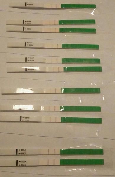 Ahojte...baby...cely mesiac si robim ovulacne testy...nic...ciarka stale slaba...tak som to brala tak, ze tento mesiac zrejme bez ovulacie ( inak som s nimi zacala prvy krat v zivote 🙂 )...po druhej dcerke mam cyklus riadne rozhadzany, ale zazrakom som posledne dva mesiace mala 35 dni...dnes mam 32dc...cize ratam, ze uz mi behom par dni pride navsteva...ale dnes som len tak spravila test...teda testy, jeden co mi zostal a druhy z novych...a toto je vysledok...ono sa to pred ms moze takto stmavnut??