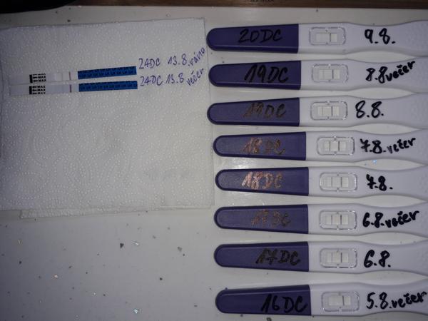 Dievcata tento cyklus som robila ovu testy kazdy den. Pozitivny bol na 14 DC, nasledne 15-16 DC bola ciarka svetlejsia a od 17-25 DC stale rovnako slabucke testy ako je odfoteny ten prvy na foto. Hned pod nim je ovu test robeny dnes a to je 26 DC - nechyba mu vela k pozitivnemu testu. Zvykne ciarka zosilniet pred menstruaciou? Mam ju dostat zajtra alebo v sobotu.