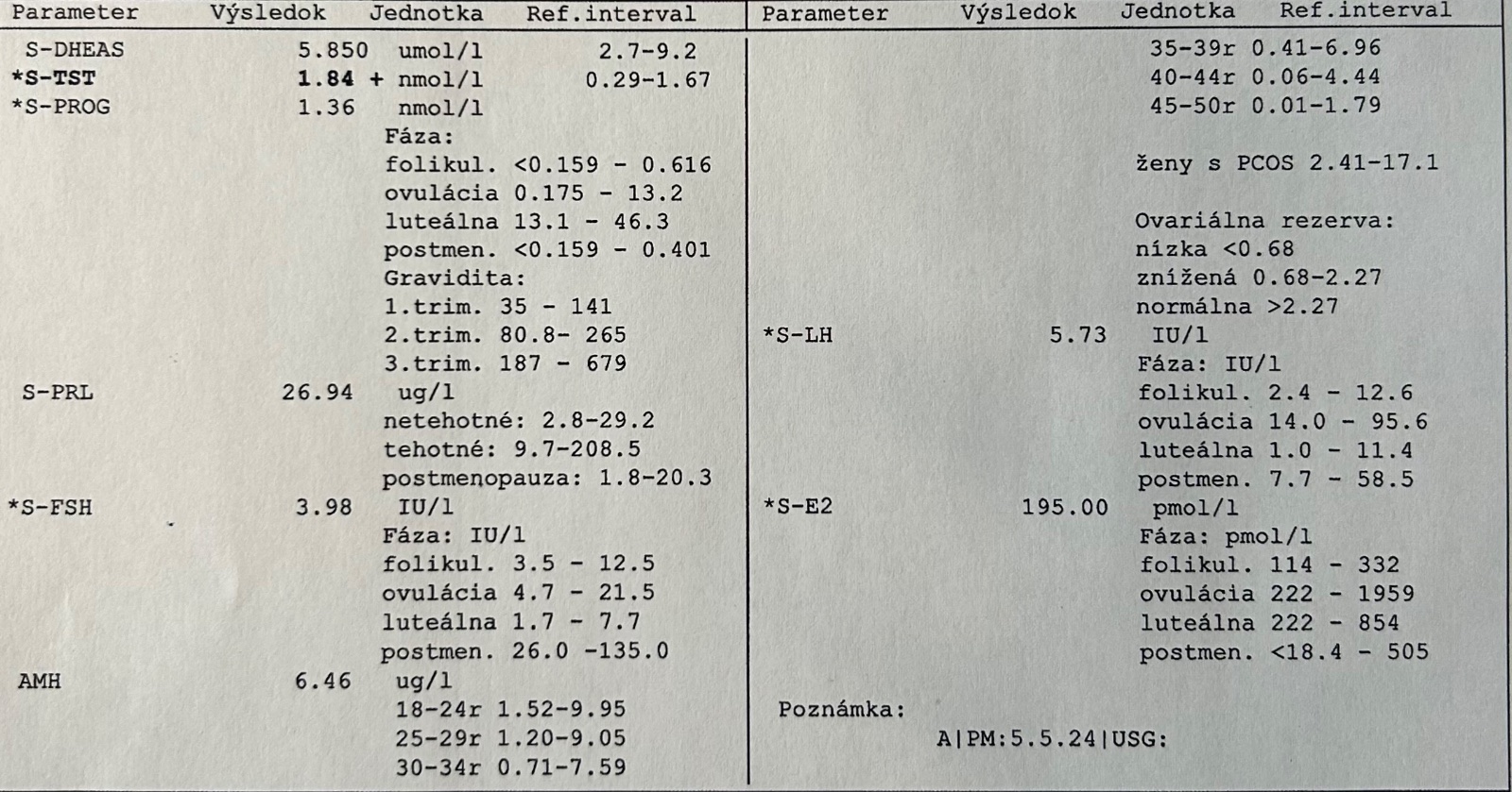 @becca1712 máš zvýšeny testosterón a zvýšené AMH, podľa mna PCOS, takze treba odsledovať ovulaciu. Aj LH a FSH nemáš v pomere 1:1, čo je znak PCOS. Mne sa PCOS prejavuje zvýšeným LH a AMH, ale v podstate aký kolvek výkyv androgennych hormónov. Ja napríklad ovulaciu spontánne nemám.