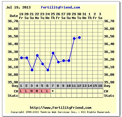 Fajne ste sa rozkecali baby 🙂 ja makám o dušu, preto sem nakuknem len občas ... nové nemám nič, resp. BT mi ukazuje blížiacu sa ovulku (aj dnes mi teplota stúpla o 0,01°C), aj keď ovu testy ukazujú 3 dni za sebou LEN ducha (aj keď zakaždým o niečo silnejšieho) ... a hlien ? hm ... v nedeľu raz taký hustejší na spodnom prádle, včera kus špinenie na toaletáku som zbadala a dnes číry hlienik s trošilinkou prímesou krvi (ale vraj je to pri ovu normálne) ... hm, ale tak neviem neviem :D akosi skoro sa mi to zdá ... sledujem sa však ďalej, veď uvidíme, hádam z toho niečo aj bude :P a tu máte môj "zázračný" grafík BT ...