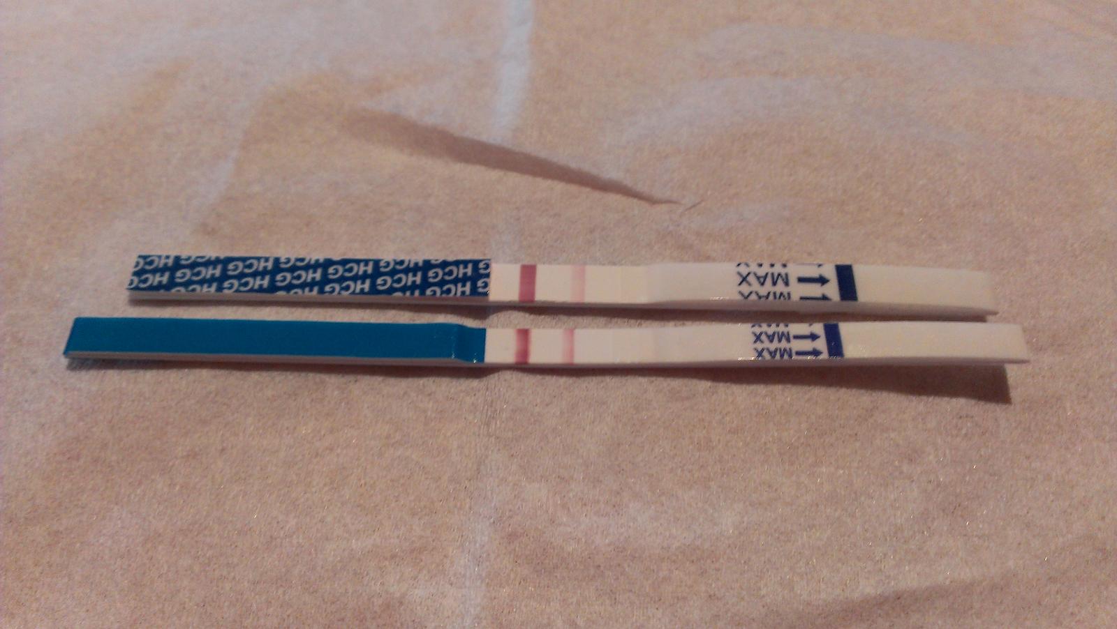 taaakze dievcence posielam foto testu z dnesneho rana a je tam aj test zo vcerajska... nezda sa vam ta dnesna ciarka trocha silnejsia (to je ta spodna)??? ci uz mam vidiny?? 😉 😉 😉