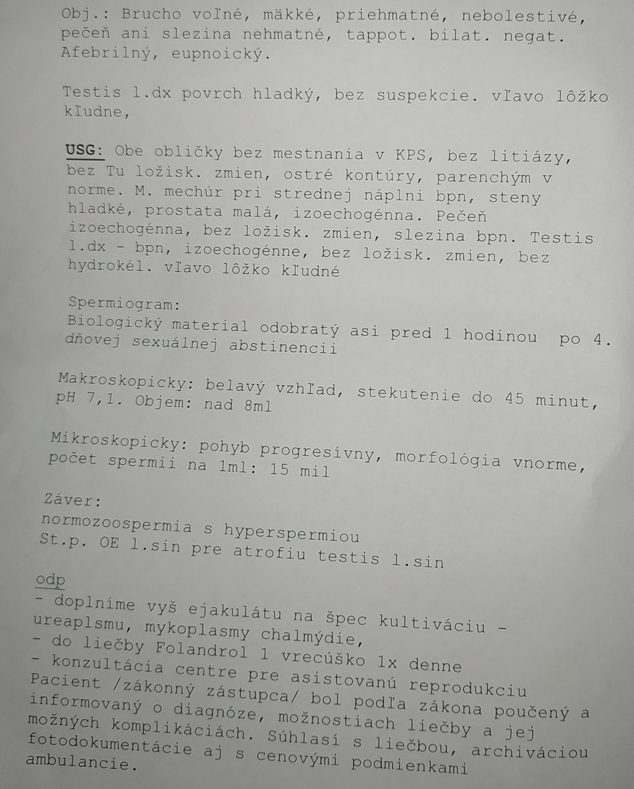 Potom tam pise nieco o atrofii semennika ale tieto ich skratky netusim co znamenaju. Atrofia je ze sa mu zda ze jeden zo semennikov je mensi ako by mal byt. K tomuto musel muzol dostat viac info ze co a ci to vôbec nieco pre neho znamena 🤷♀️