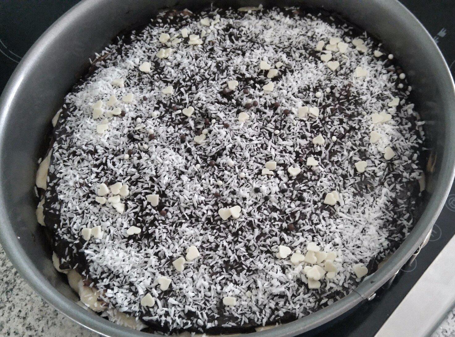 @evi789 uz je v chladnicke,necham ho 3-4hod nech stuhne cokolada 😉takze korpus mramorovy s kakaom polku,frkla Rum,pokvapkala upeceny kavou, jahodovy dzem trosililinku potrela,banany,smotanovy husty puding,varena cokolada, kokos.....podavat ho budem so slahackou 😉tolko Kaloriiii ze az 😂 potom vyfotim ked stuhne