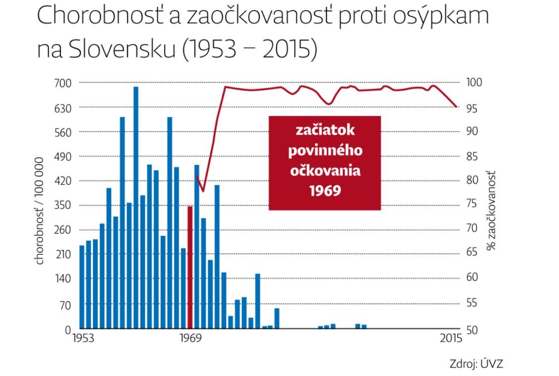 Zoberme si osýpky. V roku 1961 pripadalo na 100-tisíc obyvateľov takmer 700 prípadov osýpok. Povinne sa proti tomuto nebezpečnému ochoreniu očkuje od roku 1969, vtedy na 100-tisíc obyvateľov registrovali 350 prípadov osýpok. Po desiatich rokoch sa osýpky na Slovensku takmer nevyskytovali. Posledný domáci prípad sa objavil v roku 1998. "