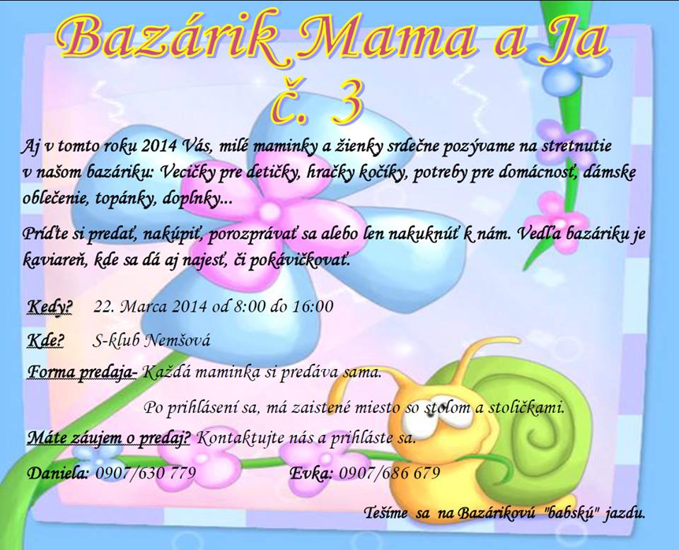 Kocky, neviete kedy bude burza detskeho oblecenia teraz na jar 2015 v Nemsovej, popride telefon na organizatorku?Dakujem.Z