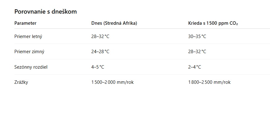 Inak k tej Afrike, čo tu píšete o 50 stupnových teplotách, dosť nepresne. Za éry dinosaurov ladovce neboli, metán bol celý uvolnený, co2 bolo až 0,15% a v Afrike v strede boli tie teploty len v priemere o 4 stupne vyššie než dnes, a aj v lete bolo 30-35 čiže stále znesitelná teplota. Zrážok bolo o 20% viac, čo je tiež dobré. A to bolo v čase ked bolo 0,15% CO2 pri roztopených ladovcoch...