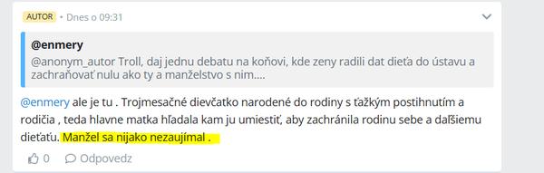 @melanta ako tak zas sú tu témy kde sa narodilo postihnuté dieťa a rodičia obidvaja ho chceli odložiť preč. Muž s k nemu nijako nemal. Vtedy polovička z vás vyjadrovala pochopenie a aj oni by ho dali atď. A zrazu aká som ja sviňa.