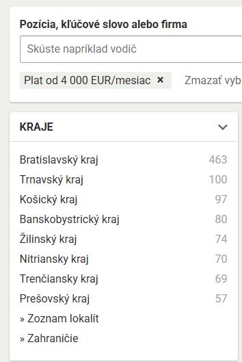 @hankab Je tam text "Rozšírené vyhľadávanie", tam das "Požadovaná výška mzdy" - tych 4000€ a vypluje ich cez 1000 (ano, su tam aj tie ako pises ze 2000-4000 s poznamkou ze podla seniority, tazko povedat kolko treba odfiltrovat, mozno ako pises ze zostane 300 ked by sme nechali iba tie kde je od 4000 nahor - bez moznosti nizsej mzdy), ked das iba pre zahranicie tak myslim ze ich bolo 176: