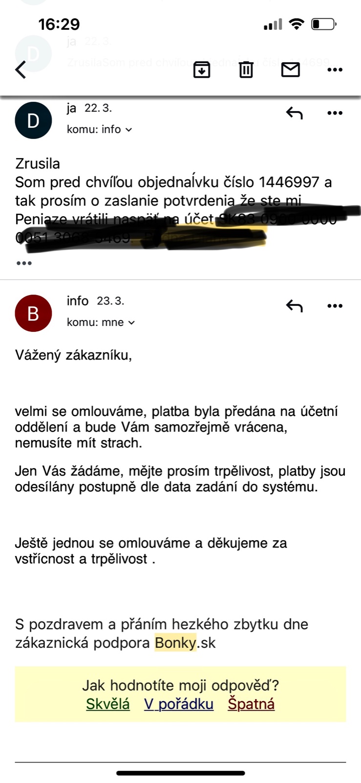 Mama si objednala tovar z bonky.sk asi v oktobri a posledne tyzdne im pisala 2x denne o vratenie penazi a cuduj sa svete vratili jej ich.