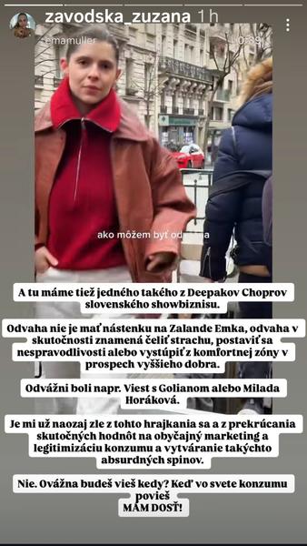 @anonym_4c5dff odpalilo mi dekel. Ona vie velke hovno o Eme, aka je, ako pomaha, cim si presla a cim inspiruje. Zuzanu musi na nej nieco strasne triggrovat, stale ju ma v ustach. A pani "vyzadujem vykanie" ju este familiarne oslovuje. A ze robi reklamu na Zalando? Pani ZZ sa prebrala z medvedieho spanku, ze zmeskala ako sa ma robit influ markenting? Ema ma skvele kampane. Tak sa to robi, do psej matere, nie pourazanim kazdeho naokolo. Hrdinka..