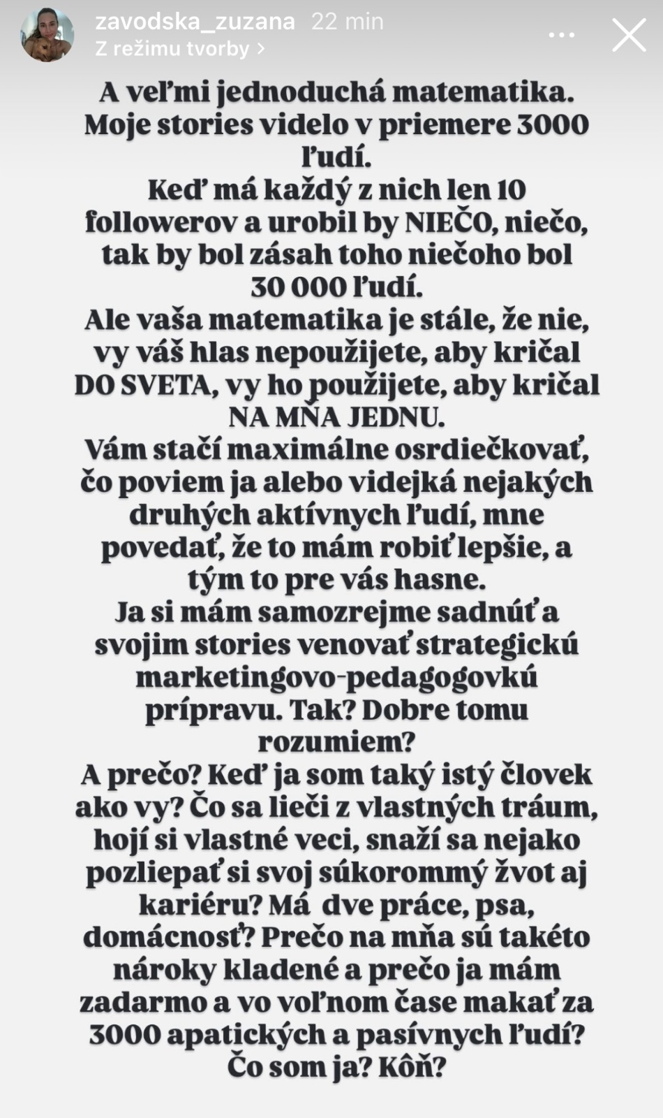 Mne príde že ona má mega traumu z detstva to ako napisala o malej Zuzanke je presne znak toho a aj tie potreby ktoré ona myslím aj na YT o nich hovorila tak chce 100% pozornosť od partnera, jeho život má skončiť a plniť len jej potreby, spať s ňou nemohol,lebo jej zavadzal a rušil ju,ona mu určovala ešte aj vôňu sprch.mydla a to sú iba fragmenty čo verejne komunikovala.