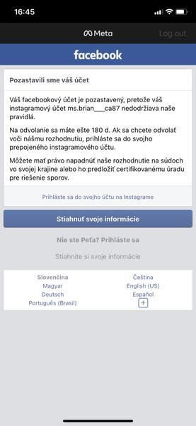 Pred vyše mesiacom sa mi niekto dostal do účtu na Facebooku, zmenil rýchlo e-mail, heslo a mňa to všade z mojich zariadení odhlásilo. Následne, keď som sa prihlásil, niekoľko krát som nahral svoj občiansky preukaz, nepomohlo ani to a vyskočilo mi, že môj účet je zablokovaný a nie je možné sa voči tomu odvolať a že môžem podať návrh na súde alebo na úrade na riešenie sporov vo svojej krajine. Malo by ísť o zablokovaný a deaktivovaný účet z dôvodu integrity a autentickej identity.