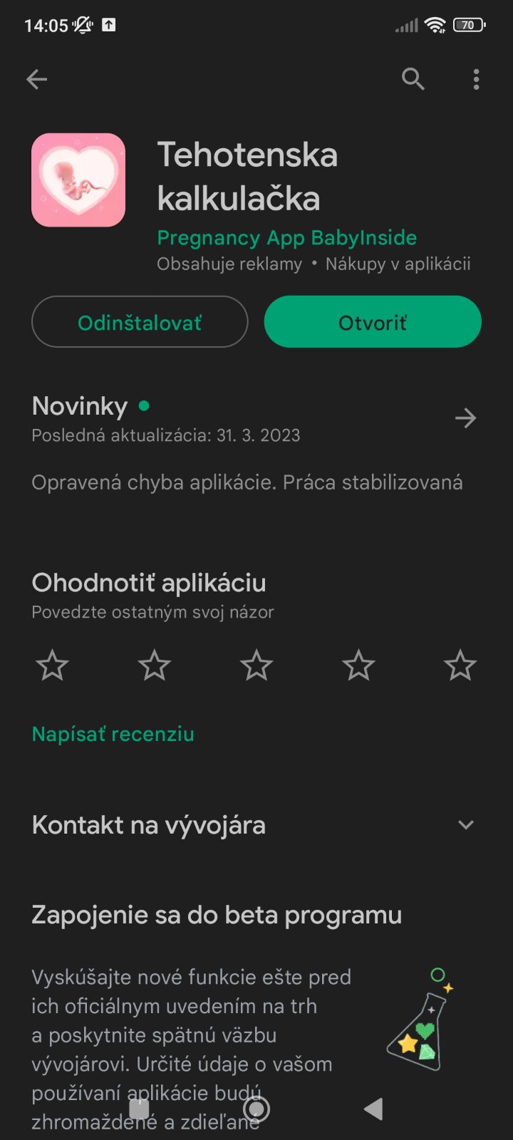 @daduska6199 No mne sa nepáči, že mi tam stále vyskakujú reklamy (nejaké videá). Tie týždne by aj sedeli, ale veľkosť bábätka v danom týždni sa mi zdá niekedy priveľká. Mám aj inú aplikáciu a tá sa mi viacej páči. Volá sa Pregnancy Tracker (taká zelená ikonka s nožičkami), ale tá je po anglicky.