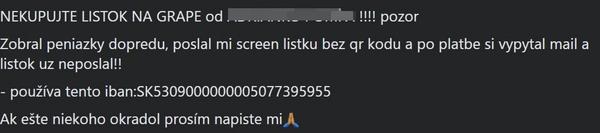 Ale poďme k veci -kontaktovala som jednu skupinu na FB ,tam sa objavil aj ten IBAN na ktorý boli poslané platby za lístky na koncert .....a aj moja platba za hru......Jedna ochotná pani na FB dala prefotenú konverzáciu dala za lístky 70 euro a nevrátilo sa jej nič nemá ani lístky ani peniaze....ďalší pán tam prišiel o 140 euro ale ten si vyžiadal od predajcu OP .Ani to nepomohlo.....prečo??????Lebo ľudia na to kašlú povedia si veď len 20 ,30 euro ....a tie vaše rady ,že je to skoro riešiť a ochrana osobných údajov ???