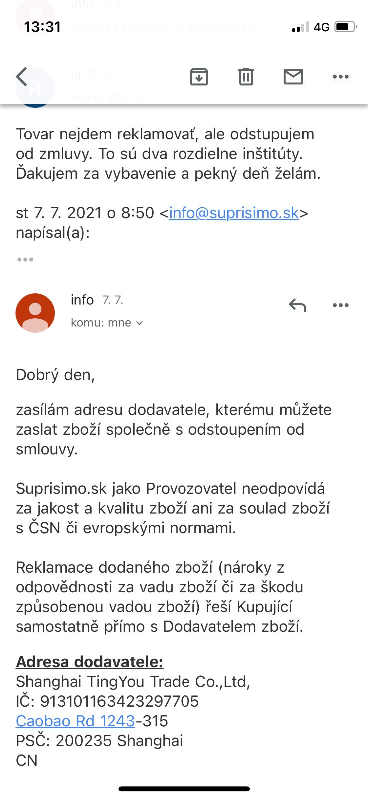 Takže takto. Uz asi 3 krát som začala písať na Coi, ale cez mobil a zakonite ma vzdy nieco vyrusilo tak som to ani raz nedoklepla do konca🤷♀️v piatok mi prisla sms zo zasielkovne. Dnes som tam sla, že to bude nejaky omyl, že som si tam nic neobjednavala(viem to, lebo ja si objednavam na ine miesto). Ale meno na balicku bolo moje a balik z Číny 🤣 hned mi doslo co to je. Ano!! Od 24.4.2021 mi presne 2.6.2021 prišiel balík zo suprisima. Asi pomohlo ze som im pisala o mojich dalsich krokoch, lebo na posledny mail mi uz odpoved ani neprisla.