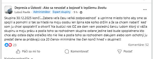 Ahojte, som členom FB skupiny Depresia a Úzkosti -Ako sa nevzdať a bojovať k lepšiemu životu: https://www.facebook.com/groups/5892082137555086. Posledné dva týždne sa admin skupiny vyhráža, že ju chce spoplatniť. Najprv členstvo 3 eur na mesiac, teraz 2 eur na mesiac. Je tam necelých 12k členov, čiže by mu pribudlo 24000 €/m. On sám tvrdí, že je podnikateľ a o svojich peňazí prispieva členom skupiny. (je živnostník a má dlhy na SP, ZP). Sú tam ľudia, ktorí naozaj v tej skupine našli podporné miesto. Aktuálne sa vyhráža, že ak ľudia nebudú prispievať, skupinu zruší 30.12. Myslím si, že toto konanie je protiprávne. Či?