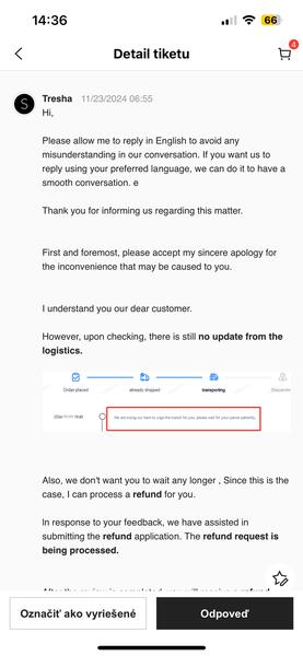 @kosimka mne tiez napisali najskor ze cakat a ze ked nepride o 6 dni tak ich znova kontaktovat, tak som o tych 6 dni napisala ze stale nemam balik ani pohyb a hned mi to dali na vratenie penazi, mna dnes kurier prekvapil ze to dorucil-vravim si tak to mam ako darcek zadarmo 🤪