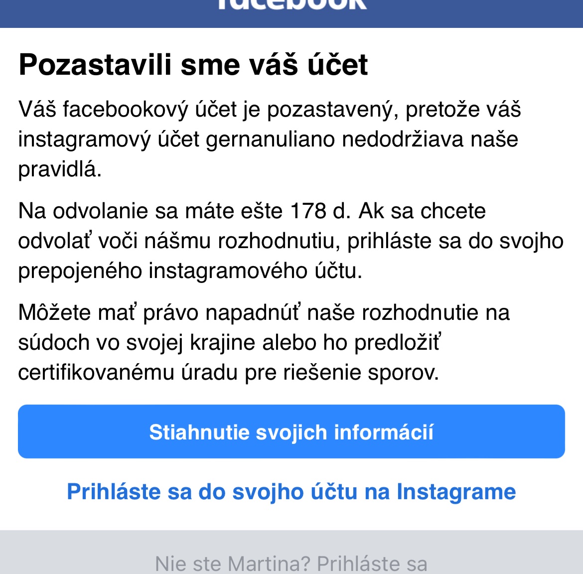 Mam sice instagram ale iny nick ako oni uvadzaju. Tak aspon cez moj instagramovy ucet som skusala pisat maily, ci spravy na centra pomoci Mety s vysvetlenim, ze sa domnievam ze ide o nedorozumenie, kedze nie som si vedoma porusenia pravidiel, ani predtym upozornena som predtym na nic nebola