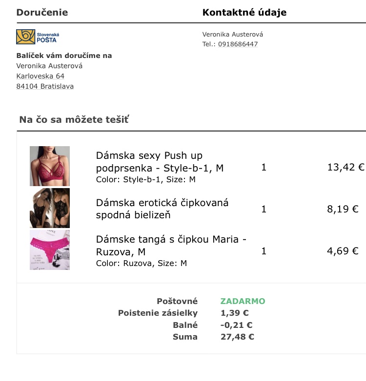 Objednala som 9.2. tri veci - viď fotku, V marci mi prišiel email že tovar je už na ceste ku mne potom 22. apríla mi posielali ten istý email že tovar je už na ceste ku mne tak sa pýtam že kde je na ceste už tak dlho a napísali mi že potvrdením obchodných podmienok som súhlasila s tým že lehota je od 5 do 40 pracovných dní… došiel mi až dnes do práce žltý papierik, tak som musela ísť na postu kde ma ešte pýtali doplatiť 2 €, a keď som to otvorila som skoro odpadla, gaťky ani neprišli a podprsenka úplne iná ako na obrázku, radšej sa nevyjadrujem ale to na seba určite nedám tak som vyhodila 30 € 🤷♀️