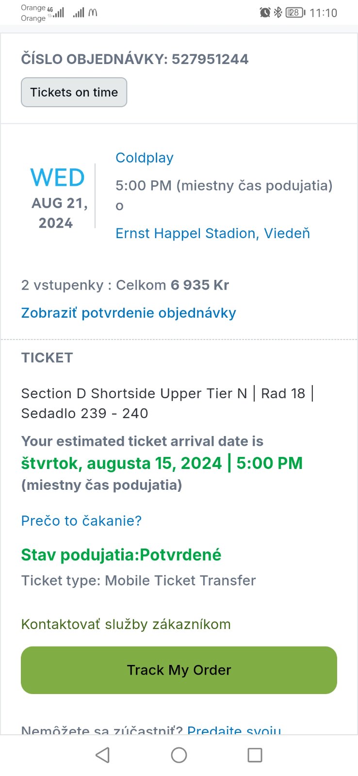 @michaela4242 ahoj. Ja som tiež kúpil lístky na Coldplay do Viedne na 21.8. Cez Viagogo, tiež som v strese či prídu. Neviem prečo v deň koncertu.